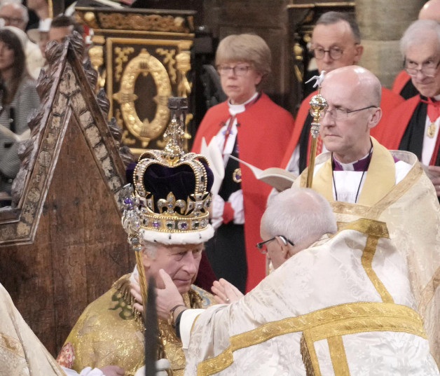 Sentado en la silla de roble de San Eduardo, considerado el mueble más antiguo del Reino Unido y colocado sobre un piso de mosaico medieval, Carlos III fue coronado tras recibir las distintas insignias reales, que simbolizan las responsabilidades como el jefe de Estado británico hasta el día de su muerte.